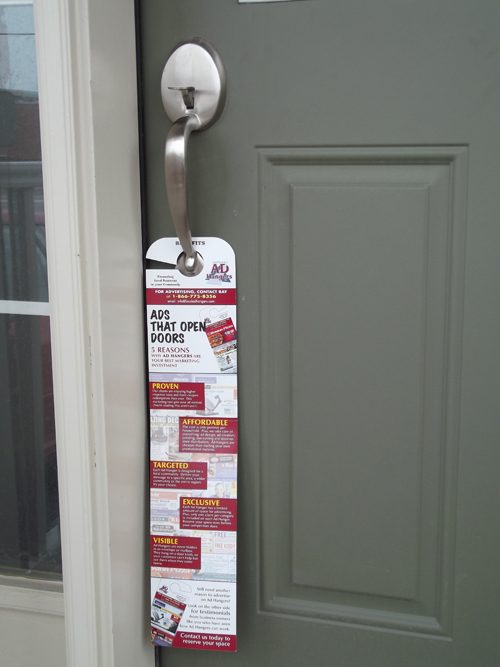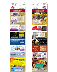 No envelopes to open. Not buried inside the newspapers. More importantly, our Ad Hangers aren’t bunched up with all the other clutter. Your ad will get noticed.