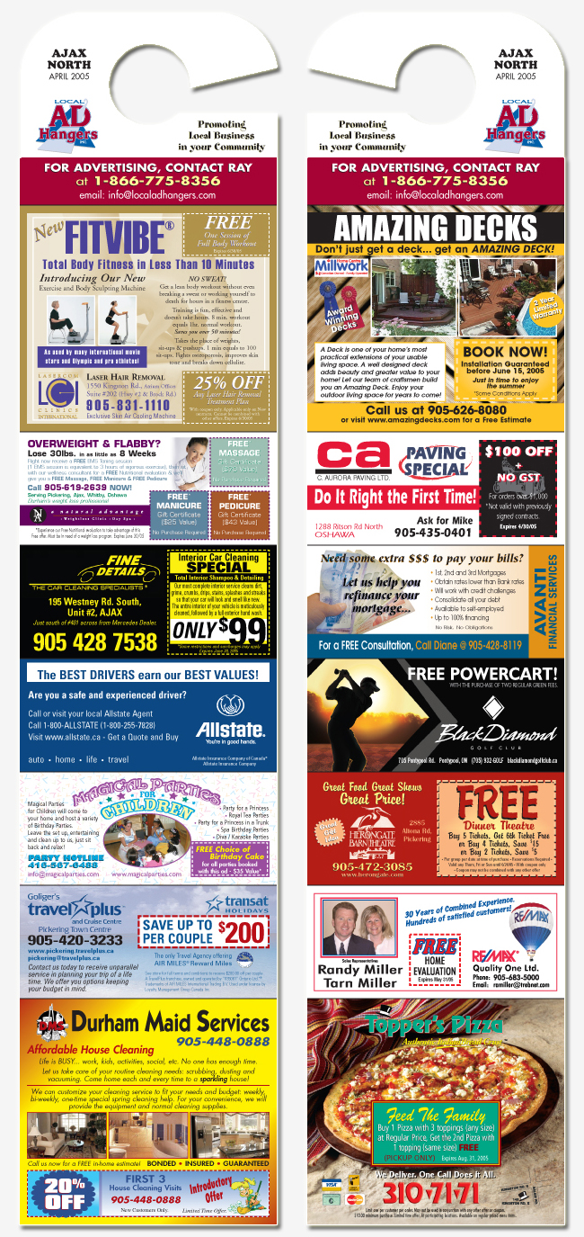 Local Ad Hangers brings a new and innovative advertising approach to the marketplace. Our Ad Hangers provide an advertising media that is direct, simple and effective in reaching customers for your business. The main objective of our Ad Hangers is to generate phone calls or increase customer traffic into your store, so that you ultimately produce a sale.